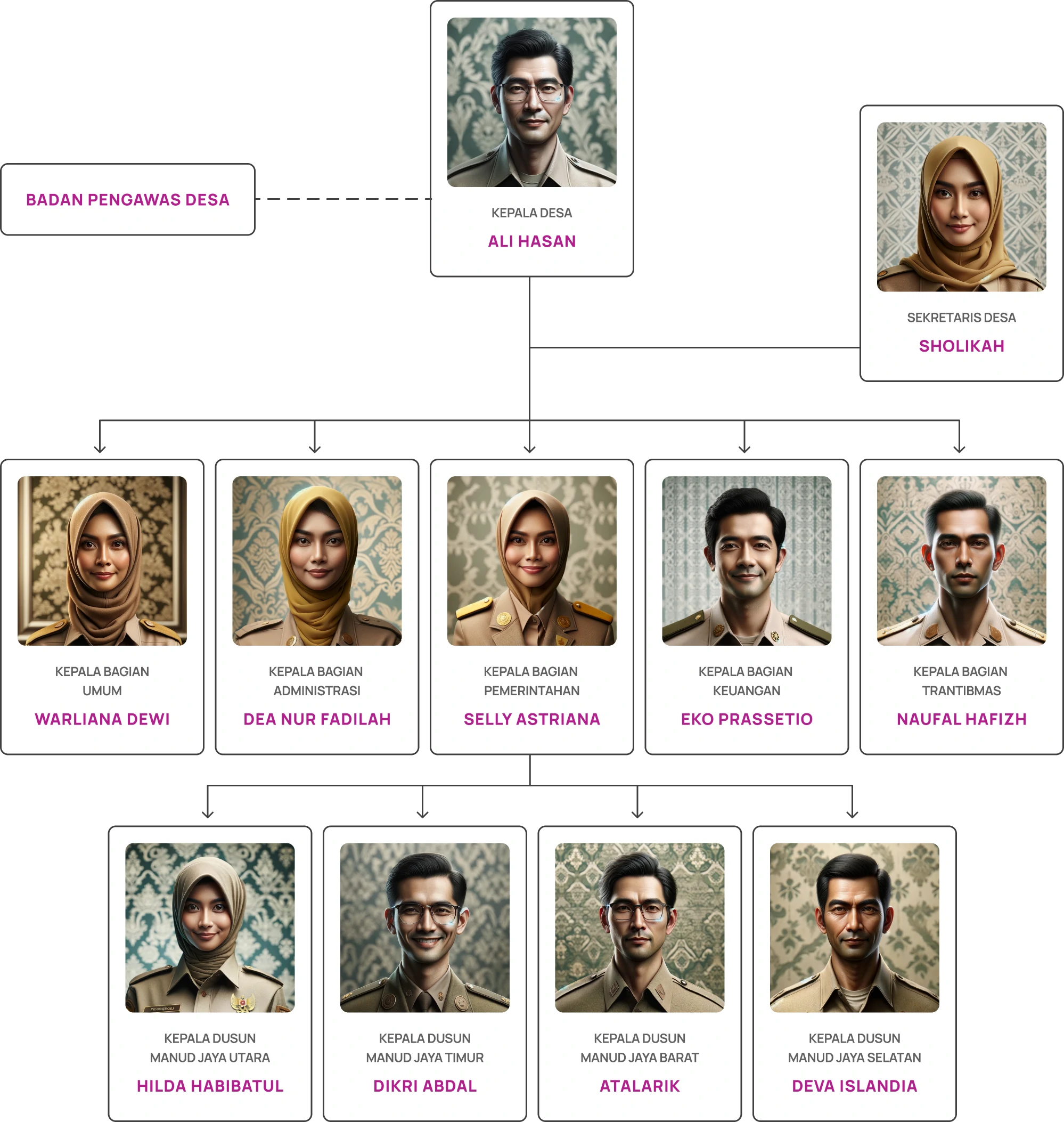 Berdasarkan Peraturan Gubernur Jaya Barat No. 88 tahun 1998 tentang Kedudukan dan Susunan Perangkat Desa di wilayah Provinsi Jaya Barat, perangkat desa terdiri atas kepala desa beserta jajarannya dan bertanggung jawab penuh dalam urusan desa.
